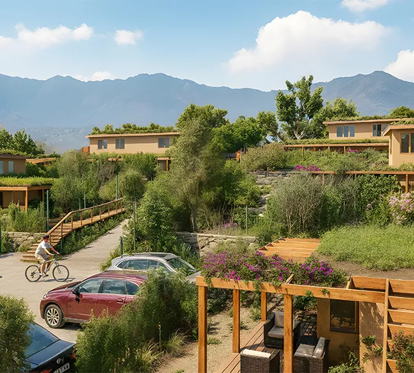 Diseñamos viviendas bajo un enfoque de arquitectura regenerativa, que no solo reduce el impacto ambiental, sino que mejora el ecosistema, integra vegetación nativa y promueve el Buen Vivir en armonía plena, consciente y respetuosa con la naturaleza.