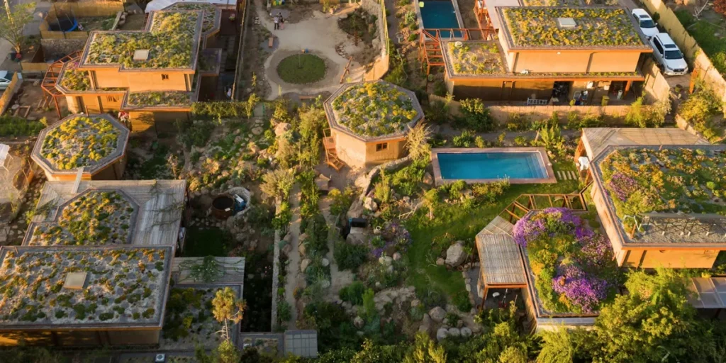 - Paisajismo con flora nativa, techos verdes, huertas comunitarias y piscinas naturales, restaurando y regenerando el entorno.